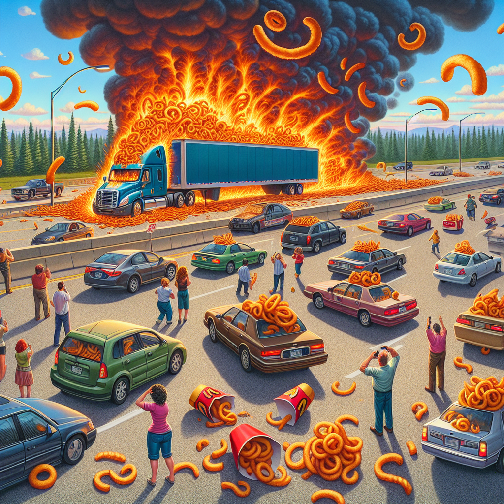 BREAKING: FRIED FRENZY ERUPTS ON MAINE HIGHWAY AS TRUCK CARRYING MASSIVE LOAD OF CURLY FRIES GOES UP IN FLAMES A catastrophic crisis unfolded on Route 1 in Maine yesterday evening when a tractor-trailer carrying a gigantic load of curly fries suddenly burst into flames, sending a massive plume of smoke and crispy, curled despair into the air