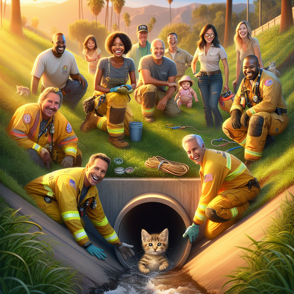 MIRACLE IN THE DRAIN: Kitten Rescued from California Storm Drain A dramatic rescue unfolded in the San Fernando Valley area of Los Angeles, California, yesterday evening, as a team of brave responders worked to save a stranded kitten trapped in a storm drain
