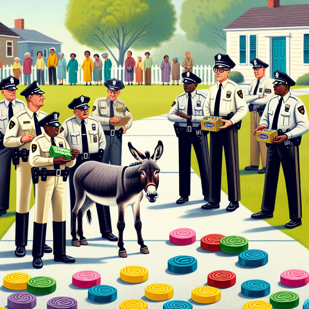 HEADLINE: Unconventional Standoff: Police Use Mints to Lure Rogue Donkey Back to Safety SUBHEADLINE: Bizarre Incident Brings Community Together as Authorities Employ Creative Tactics to Capture Wayward Burro In a peculiar turn of events, a loose donkey brought a neighborhood to a standstill yesterday evening, with police employing an unorthodox method to coax the wayward animal back to safety