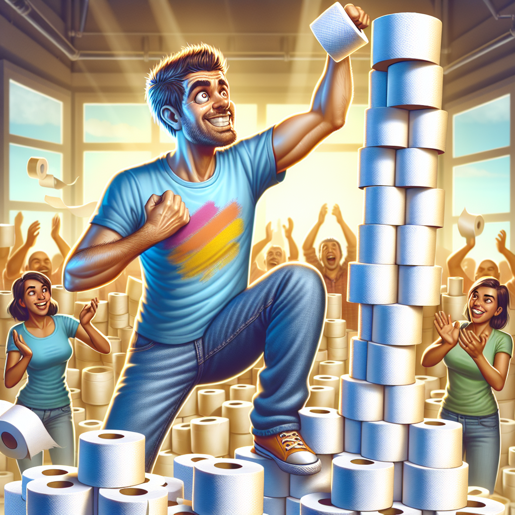 LOCAL MAN DEFIES ODDS, STACKS TOILET PAPER ROLLS WITH ONE HAND TO BREAK WORLD RECORD In a bizarre display of dexterity and determination, 32-year-old John Smith of Springfield, Illinois, has successfully stacked 25 toilet paper rolls on top of each other using only one hand, shattering the previous Guinness World Record