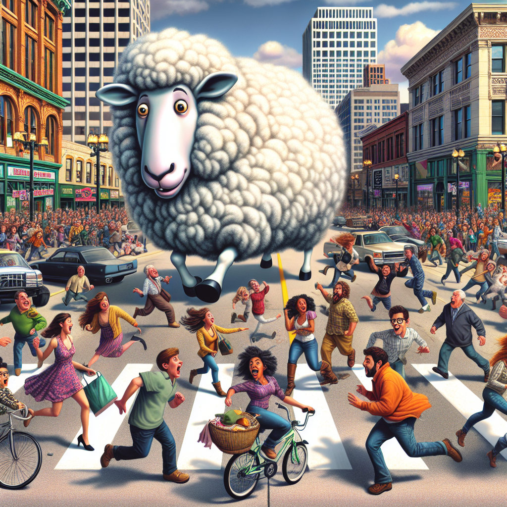 BREAKING: FLEECY MENACE ON THE LOOSE! Milwaukee, WI – In a bizarre incident that has left animal control officers baffled, a gigantic sheep on the lam was finally corralled after a thrilling chase through the streets of Milwaukee