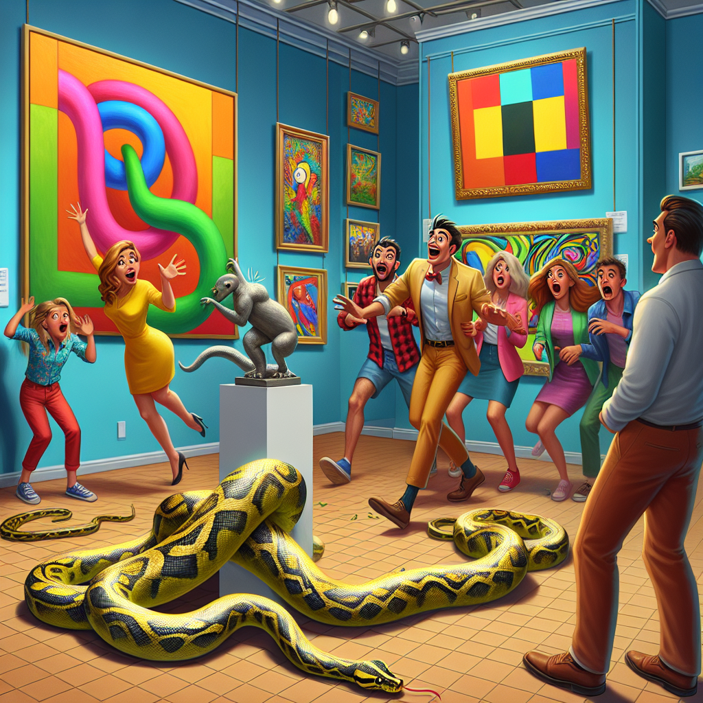 PYTHON ON THE LOOSE: Reptile Rampage Rocks Local Art Gallery In a bizarre incident that has left art lovers and gallery owners alike in stitches, a mischievous pet python named “Slinky” escaped from its owner’s grasp and wreaked havoc on a local art gallery yesterday evening
