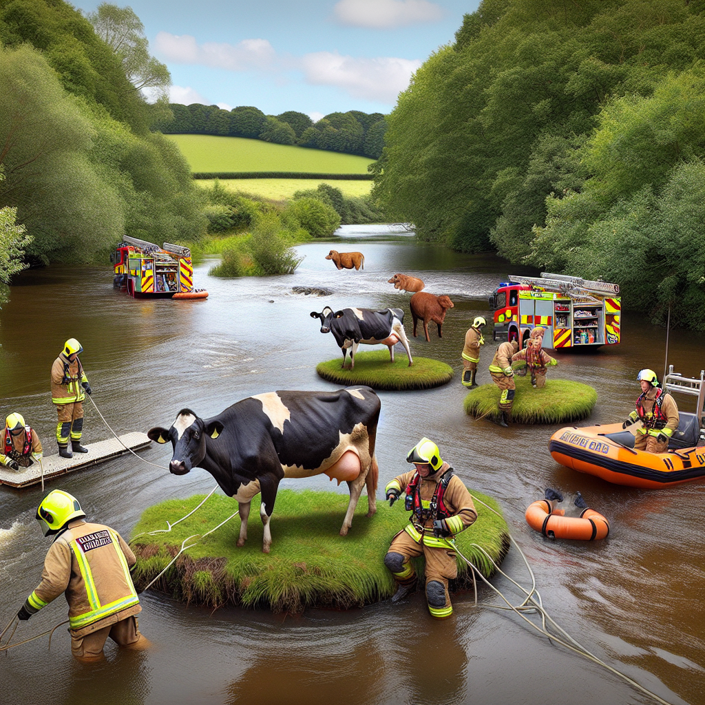 “We received a 999 call from a concerned farmer who reported that two of his prized cows had taken an unexpected swim,” said Chief Fire Officer Reginald P. Bottomsworth. “We sprang into action, mobilizing our crack team of firefighters, animal rescuers, and a fleet of boats to prevent a bovine disaster of epic proportions.”