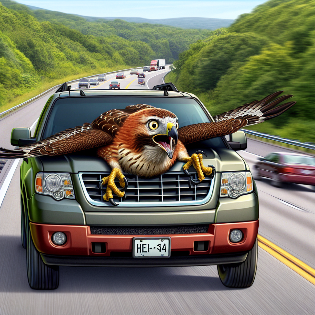 Eyewitnesses claim the hawk, identified as “Hank” by local wildlife experts, was flying high above the highway when he spotted a particularly succulent squirrel on the side of the road. In his haste to snatch the snack, Hank misjudged the distance and found himself lodged in the grill of a passing SUV.