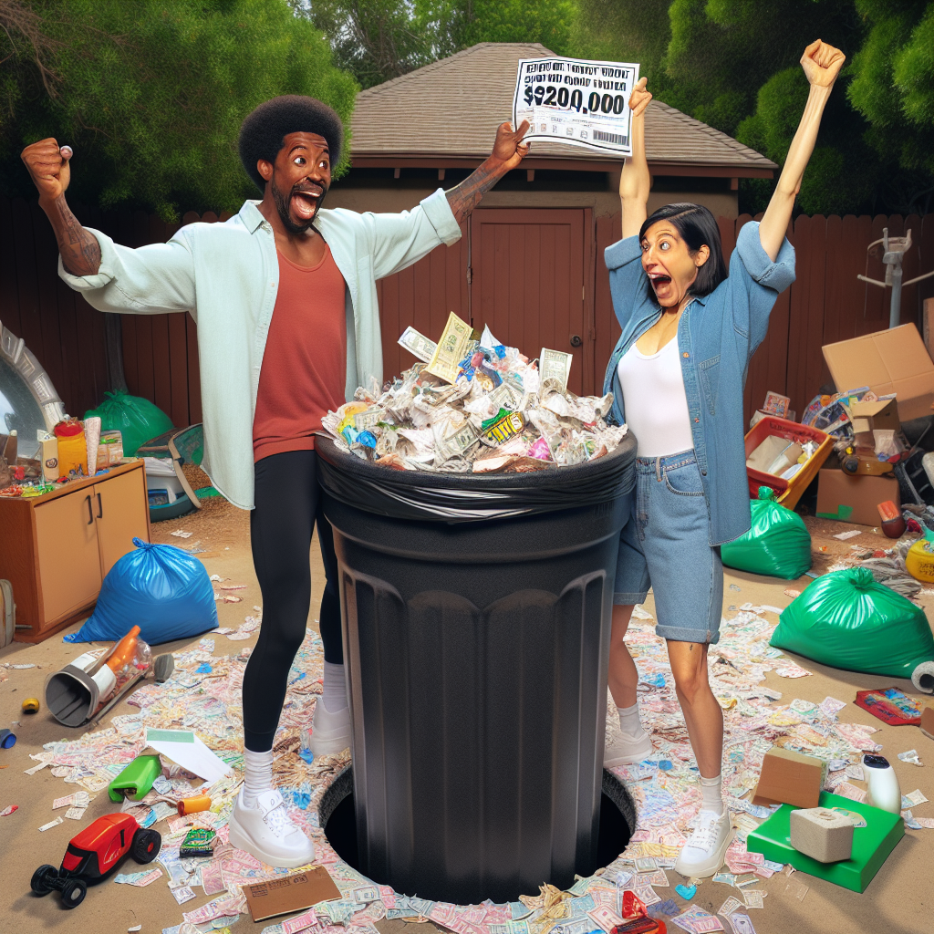 COUPLE PULLS OFF MIRACULOUS TRASH DIVE, RECLAIMS $200K LOTTERY TICKET IN DEATH-DEFYING FEAT In a jaw-dropping, spine-tingling, and downright unbelievable turn of events, a local couple has managed to fish out a $200,000 lottery ticket from the depths of their garbage can, mere hours before it was scheduled to be carted off to the landfill and reduced to a mere memory