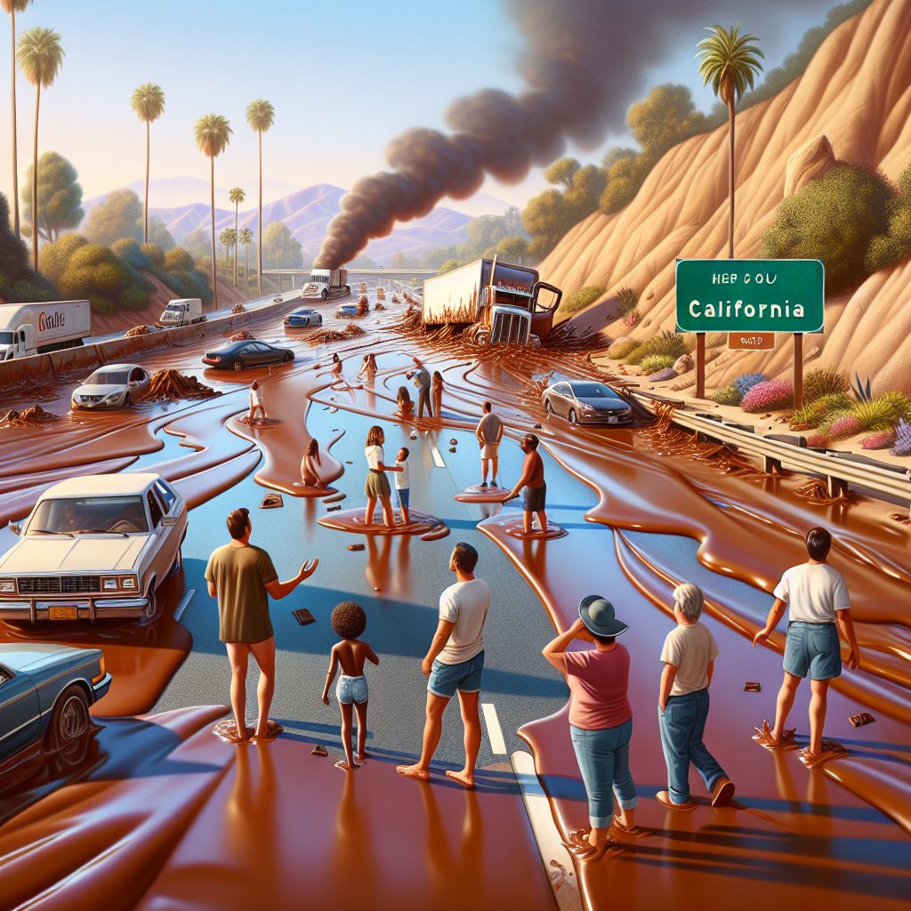 Highway to Chocolate Heaven: California Drivers Stranded in a Sticky Sweet Dream CALIFORNIA – In a truly one-of-a-kind incident that sounds suspiciously like the plot of a kid’s movie, a truck fire on a California highway has transformed an ordinary stretch of asphalt into a surreal chocolatey wonderland