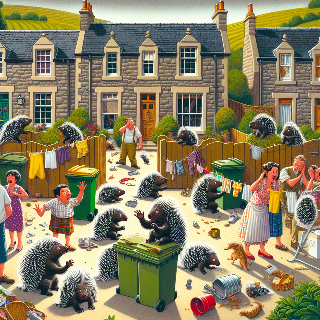 BREAKING: PRICKLY PANDEMONIUM ERUPTS IN SCOTTISH NEIGHBORHOOD AS ROGUE PORCUPINES WREAK HAVOC In a bizarre incident that has left residents scratching their heads and reaching for the calamine lotion, a group of mischievous porcupines escaped from a Scottish farm and wandered into a nearby neighborhood, causing chaos and destruction in their wake