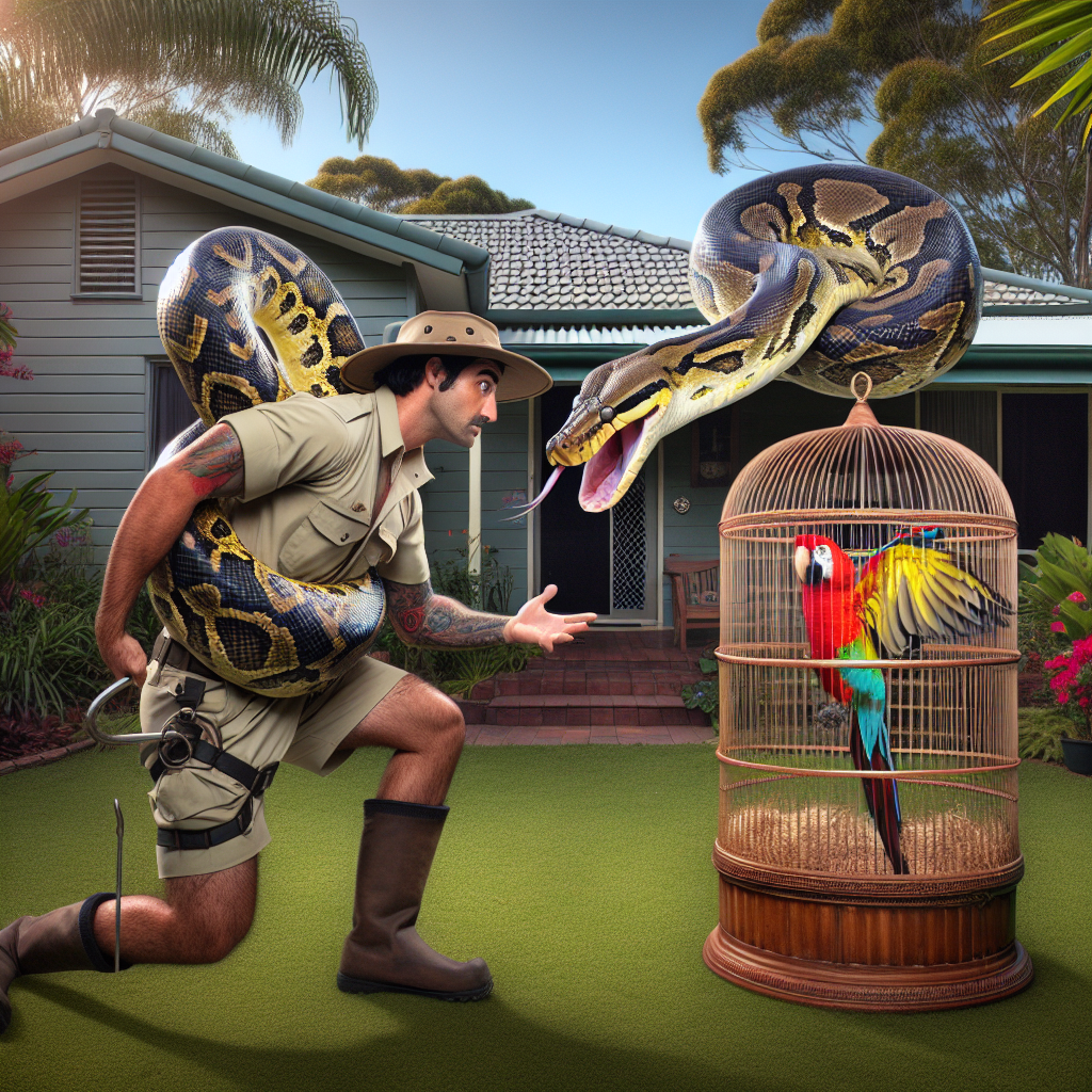 BREAKING: SNAKE-GATE ROCKS SUBURBAN AUSTRALIA In a heart-stopping, beak-gripping, feather-ruffling incident, a daring snake catcher was summoned to a quiet suburban home in Australia, where a brazen coastal carpet python had invaded a pet bird’s pad and nearly became its new best friend