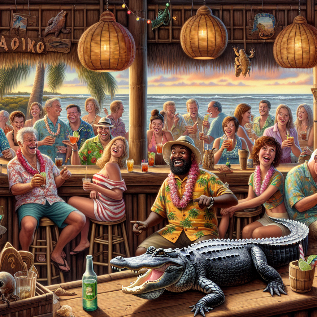 STUART, FL – In what experts are dubbing a bold move against the widely accepted rule of ‘no reptiles at happy hour,’ a thirsty alligator decided that a local tiki bar was the perfect spot to unwind and enjoy a drink. Patrons of the establishment were captivated as the scaly intruder crawled in, presumably seeking the finest cocktails the bar had to offer while simultaneously announcing an old adage: “If life gives you swamp water, head to the tiki bar!”